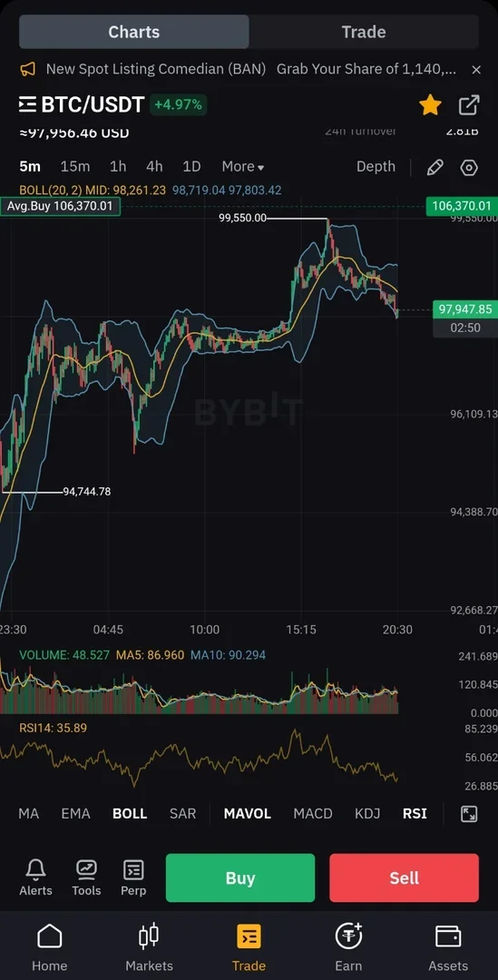 2. 5분봉에서도 rsi가 30근처에서 돌아나오는 느낌이 들었고 볼린저 밴드 하단에서 올라오는 듯한 느낌을 받음.