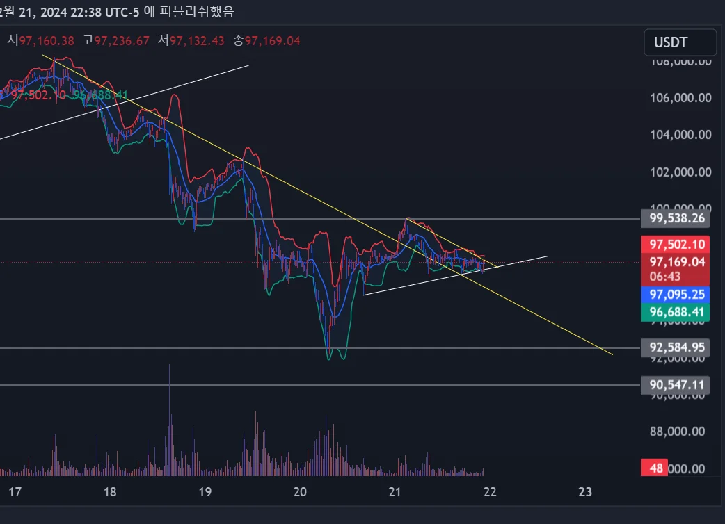 92K 부근에서 반등을 하면서 저점을 높이고 고점을 낮추는 모습이 보이는 거 같아 추세선을 그어 봤습니다.