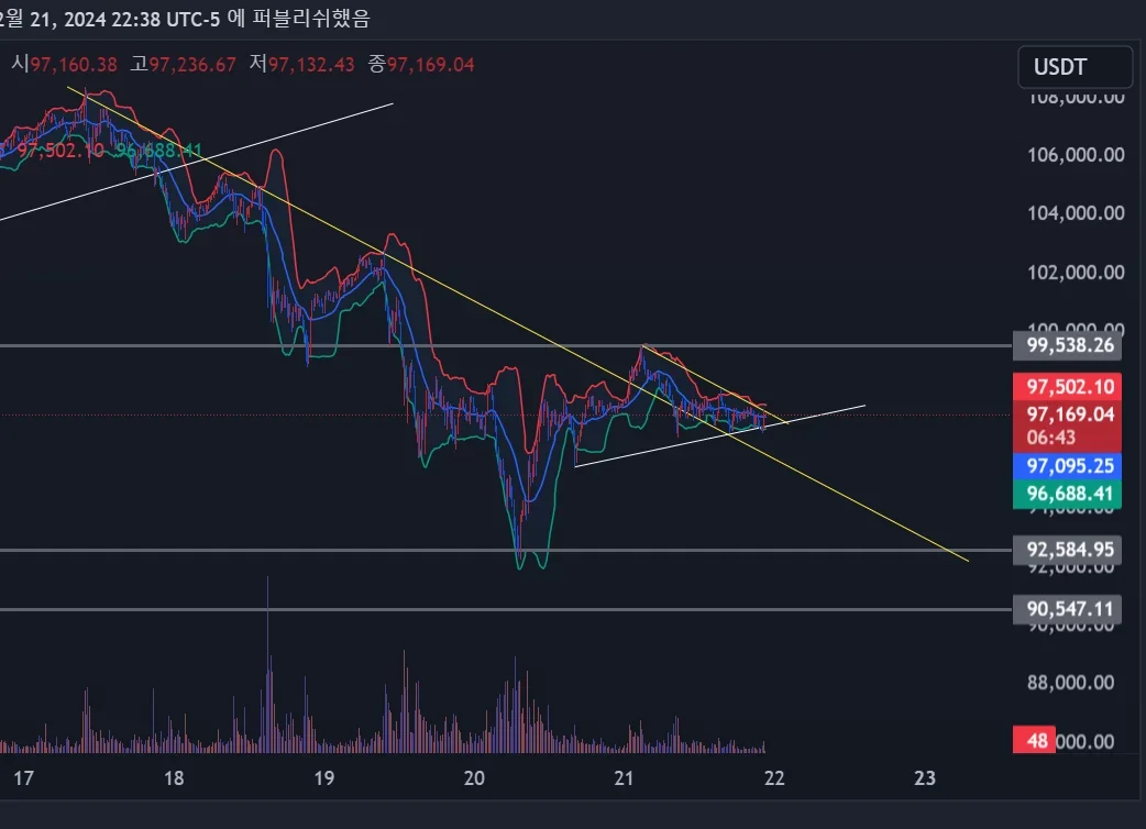 92K 부근에서 반등을 하면서 저점을 높이고 고점을 낮추는 모습이 보이는 거 같아 추세선을 그어 봤습니다.
