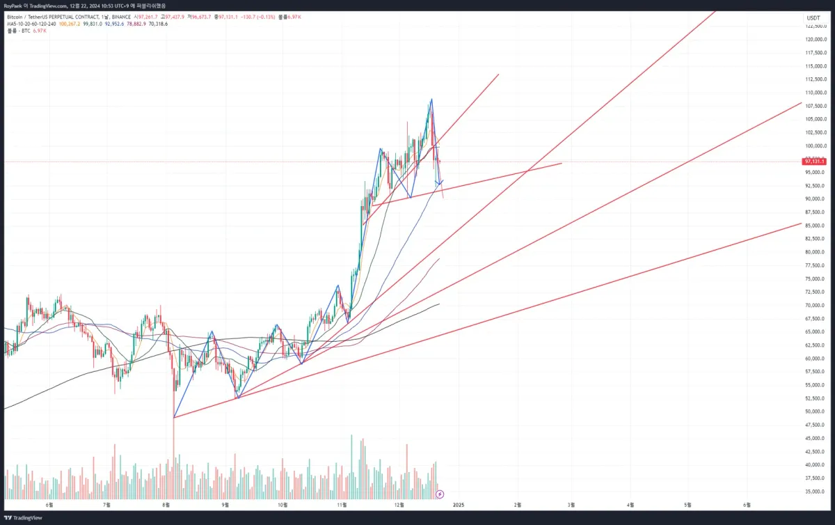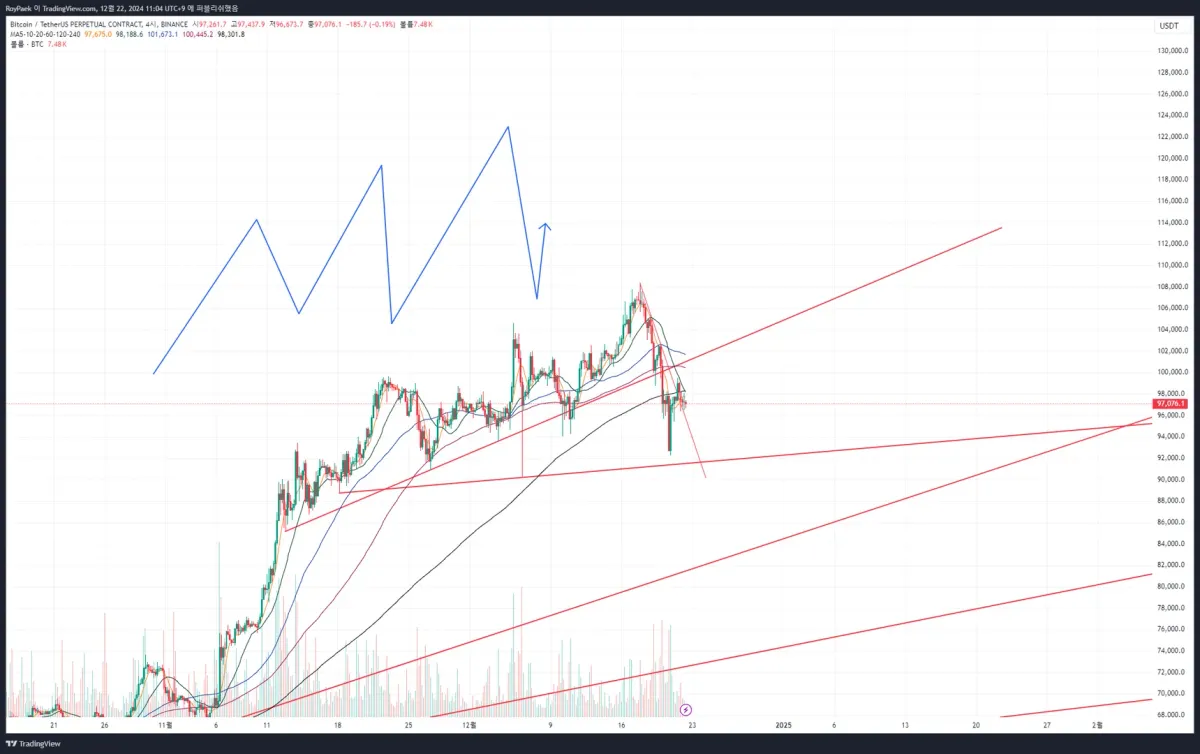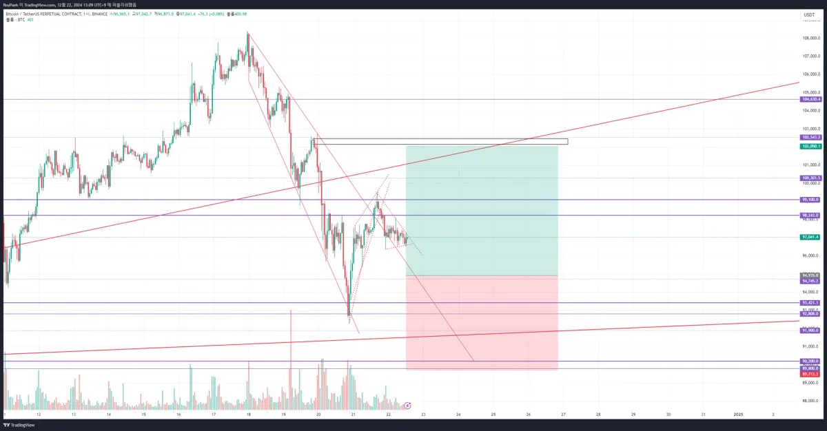 - 1차 진입: 94935 (하락 추세선 + 지지/돌파가 있었던 매물대)