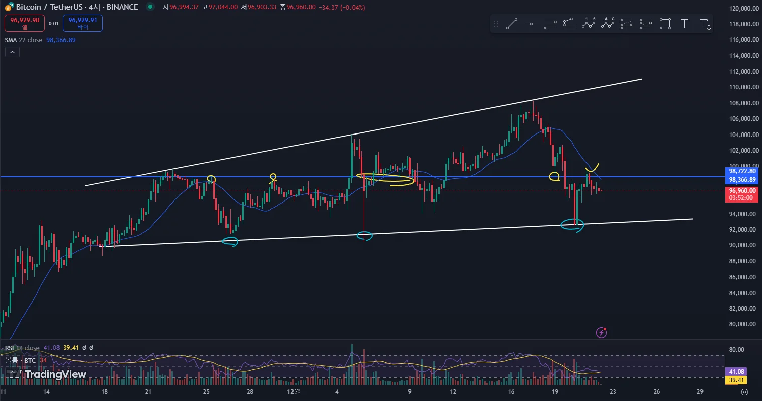 또한 98.7k 부근의 저항선이 있는 것으로 생각되며 해당 선에 저항을 받아 내려와 횡보를 하고있는 모습입니다.