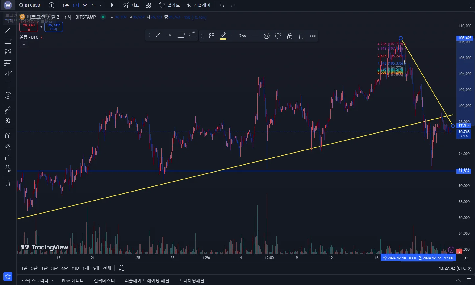 상승 추세를 보이다가 하락 추세를 보여 노란색으로 추세선을 표시해보았습니다.