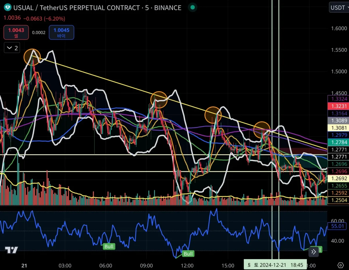 상단 저항 4회 터치 후 상승하지 못하고 하락 확인