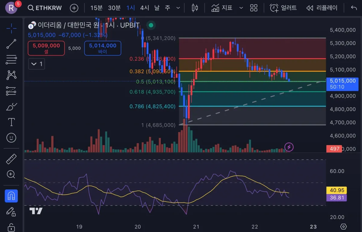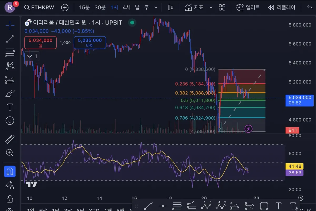 0.382와 0.5 박스권은 전저점의 지지선 현재 저항선으로 보여 집니다.