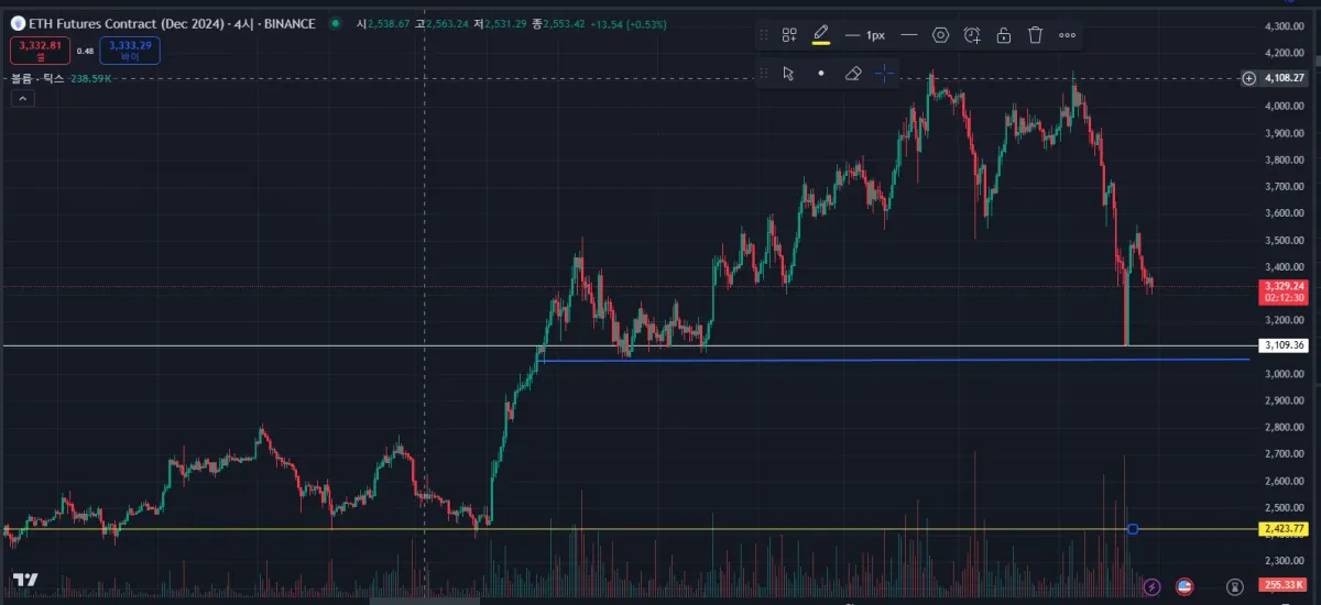 지지선 그리는 과제 늦게라도해봅니다. 제가 들어가 있는 이더리움이고, 하얀색이 1차지지선, 파란색이 2차 지지선, 노란색이 3차 지지선이라고 생각합니다