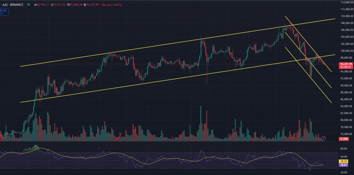 1. 4시간봉 기준 장기 상승 채널 안 단기 하락 채널이 발생했다고 생각합니다