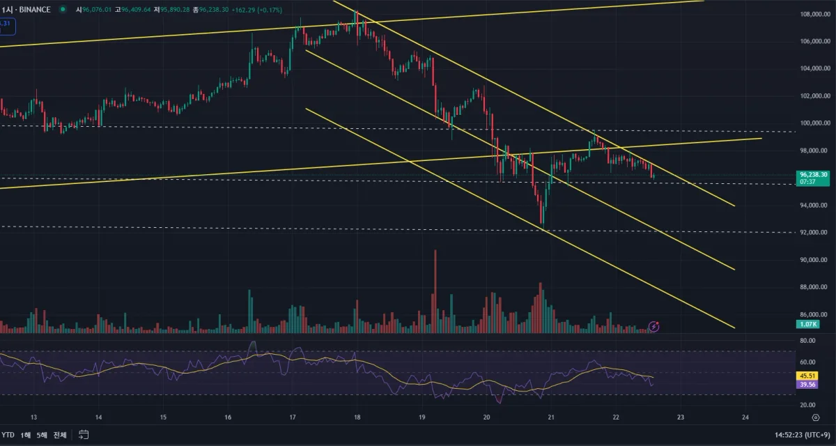2. 1시간봉 기준 채널 상방에서 횡보 중