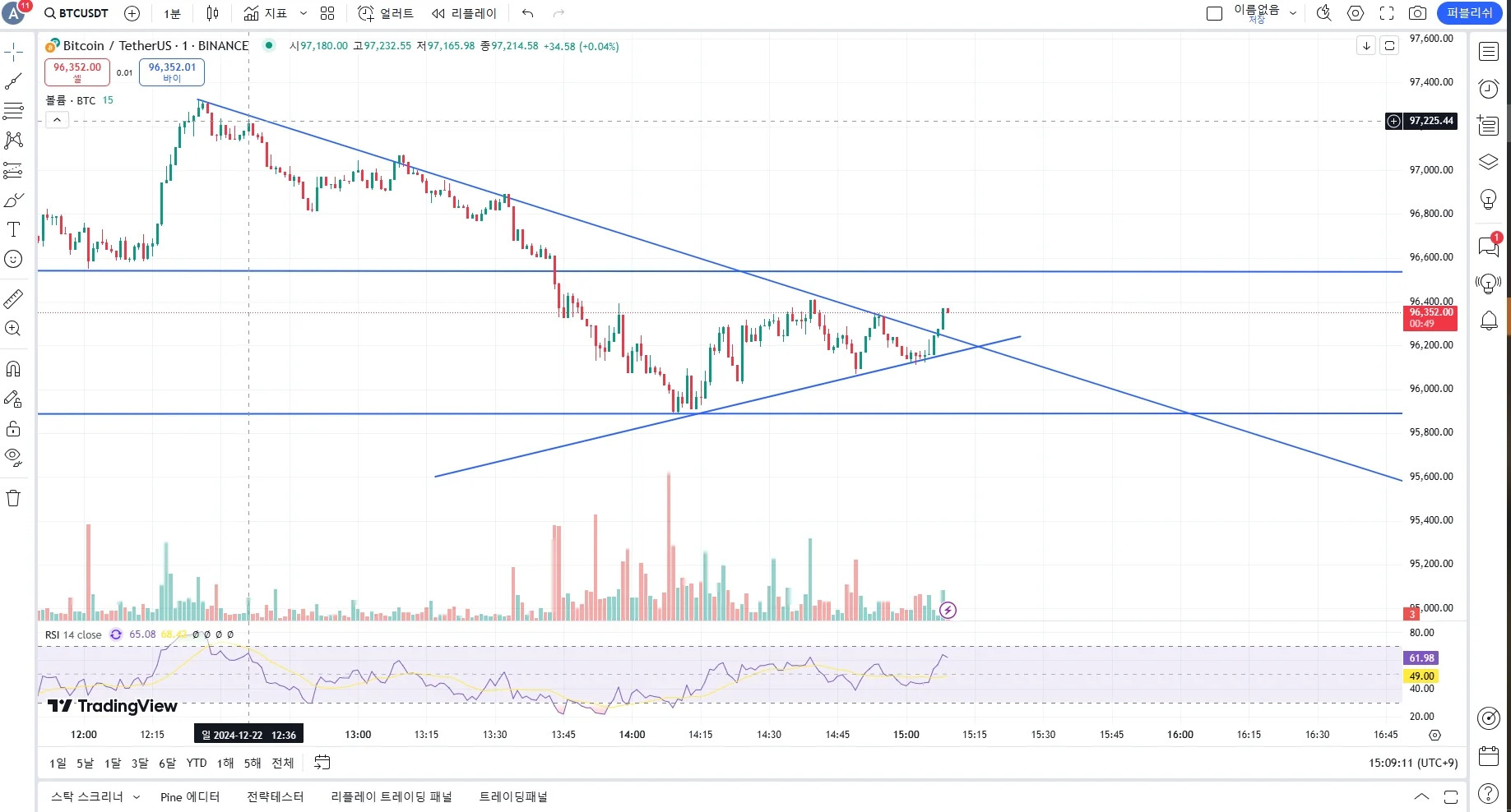 안녕하세요 트레이딩뷰에서 BTC/USDT 차트에서 1분봉으로 추세 지지 저항을 만들었습니다.