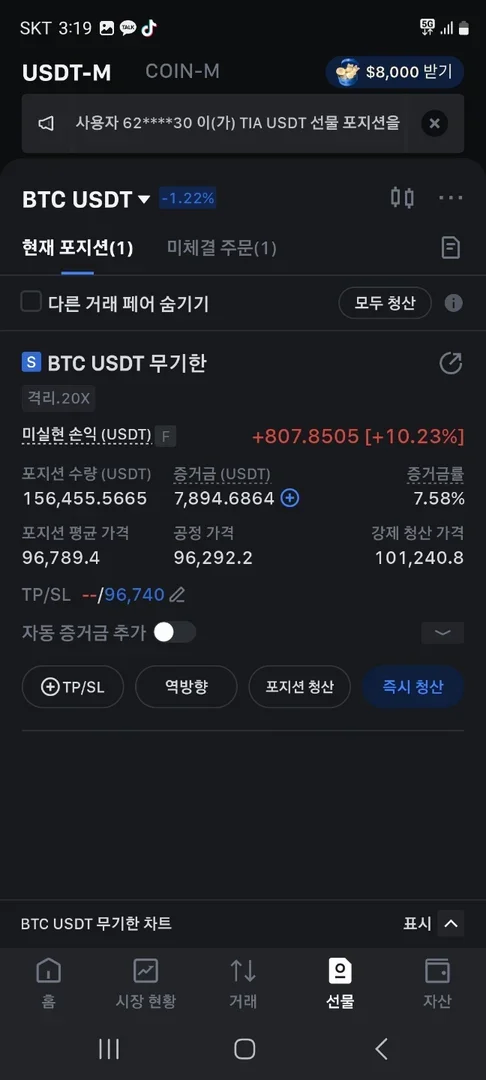추세기반 피보로 1:1자리 보고들어갔습니다