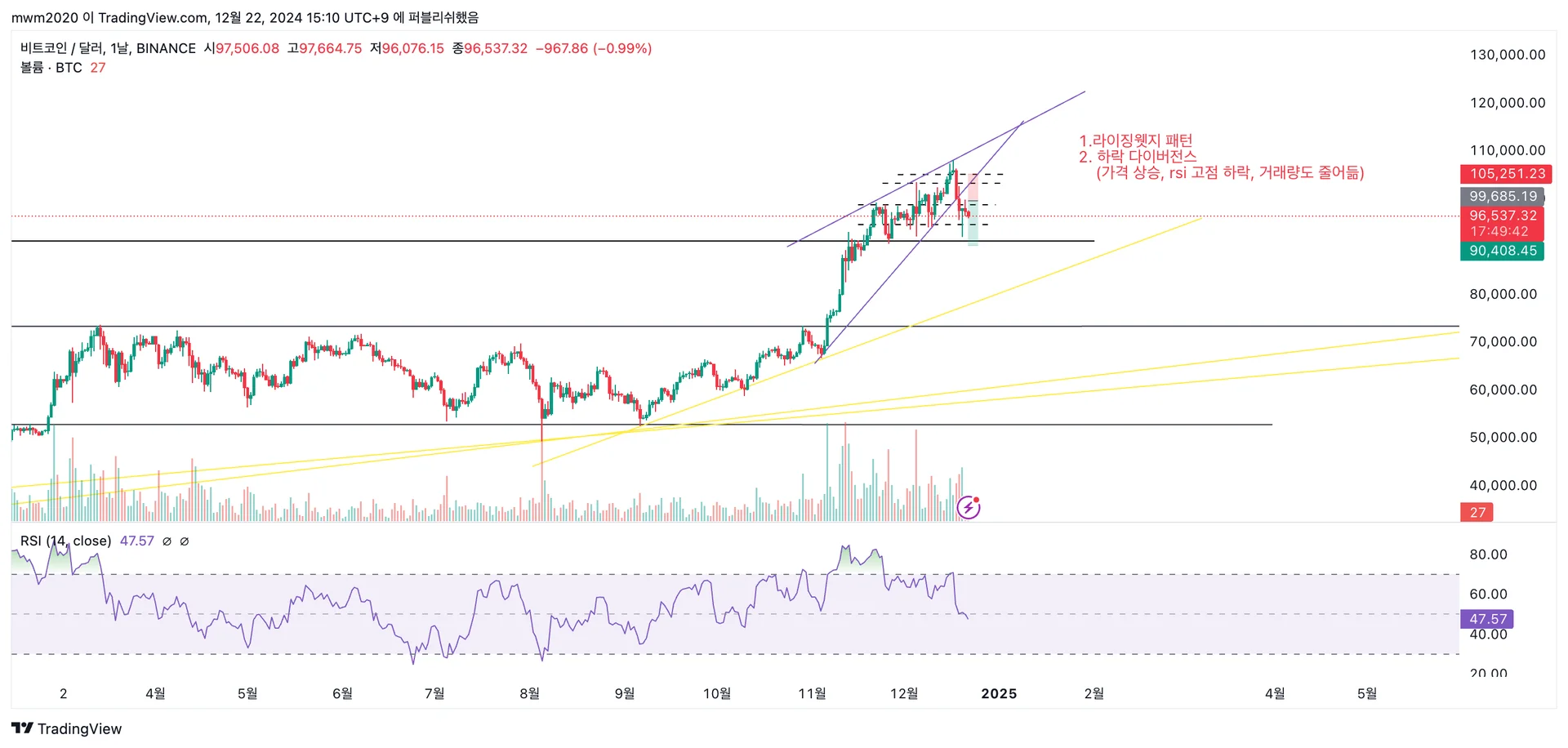 [4시간 봉] 에서는 라이징웻지 패턴 + 하락 다이버전스가 있어서