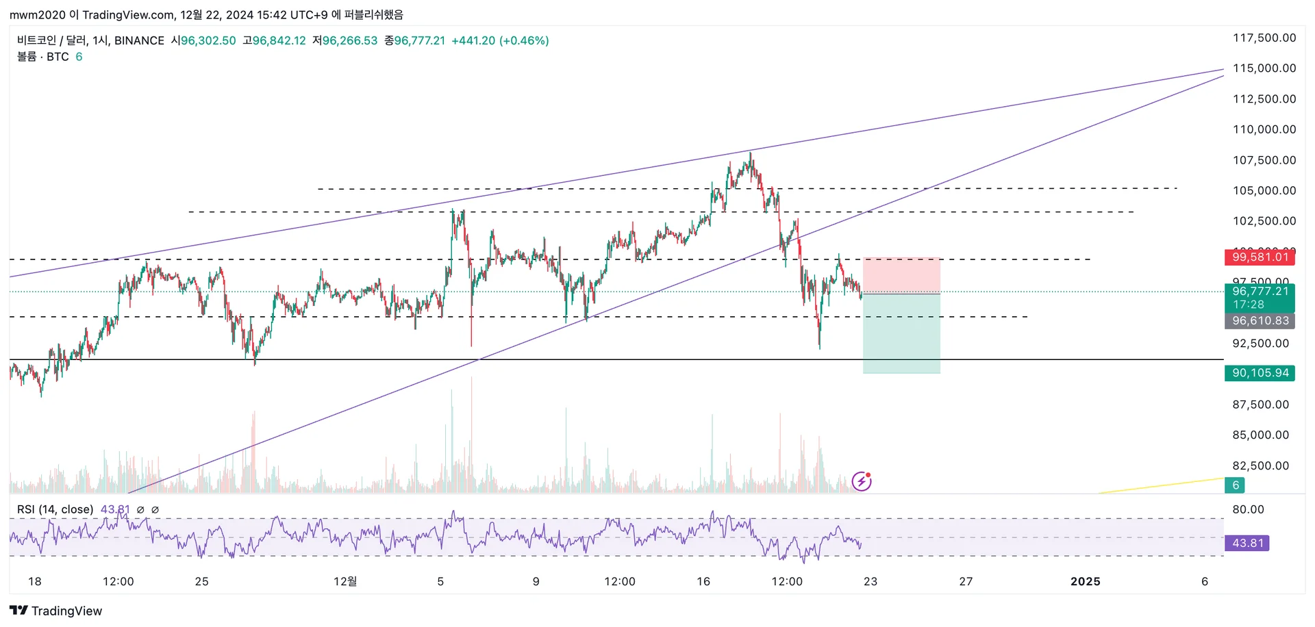 단기적으로는 까만 실선으로 표기한 지지저항 선까지는 하락할 것 같아서 숏 포지션 진입