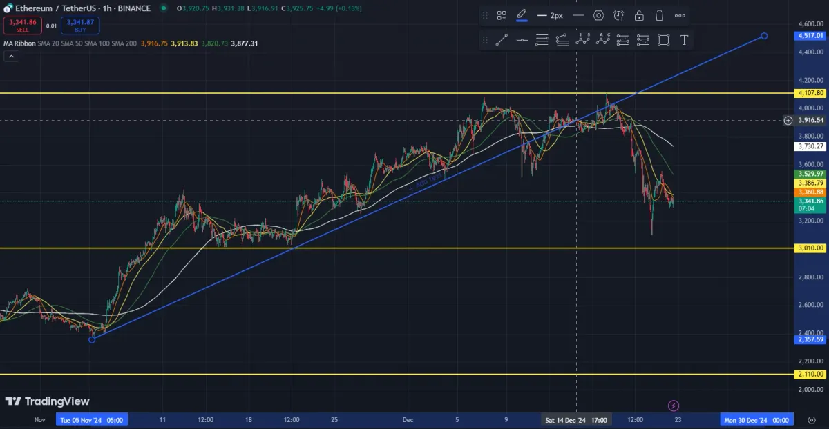 이더리움 4시간 봉을 기준으로 작도 후 1시간 봉으로 조회한 모습입니다.
