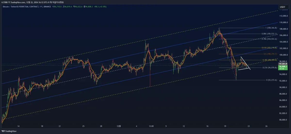 상방 추세이긴하나 현재 상추세선을 이탈하고 있는 상황이라, 이평선위에 안착하고, 흰색추세선을 위로올려 추세선 안으로 들어와, 피본나치 0.618까지 올려줘야 상방으로 방향이 전환되었다고 1차안심할 수 있겠습니다!!