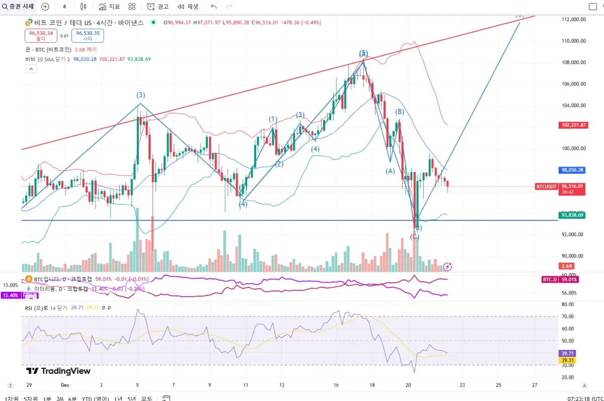 볼린저 밴드 상단을 찍고 20일 이평선을 저항선 역할을 하면서 하락하는 것을 볼 수 있었다. 추가하락이 왔고 밴드의 폭이 좁아지면 밴드 아래로 가격이 내려갔고 rsi지수 또한 차트 아래로 내려갔기 때문에 매매를 하였다. 또한 비트 도미넌스가 60%까지 올랐기 때문에 분할 매수를 할 만하다고 생각하였다. 이 종목은 현재 공부를 위해서 투자하였지만 앞으로 중장기투자를 할 종목으로 중간중간에 기회가 된다면 추가 매수를 할 것이다.