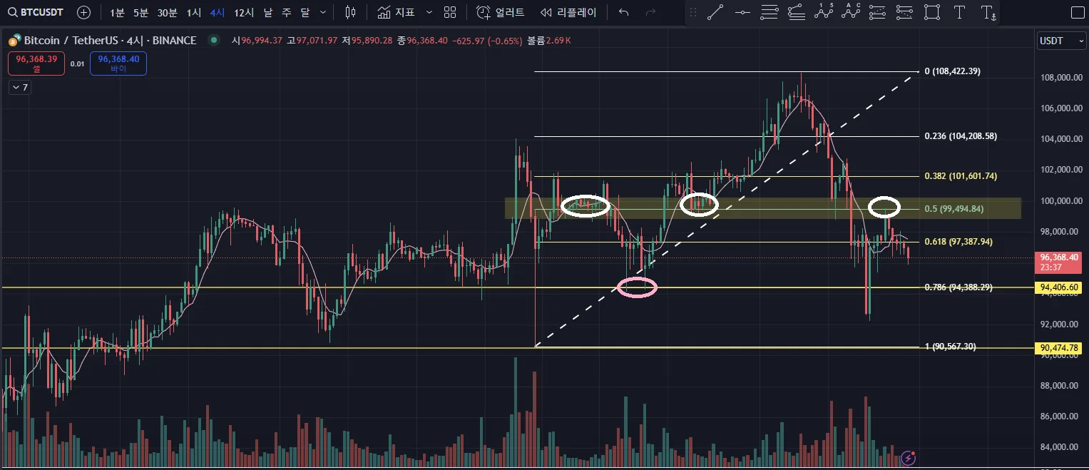 94.4k를 터치하면 1차 매수, 추가 하락시 90.4k에서 2차 매수를 해봄직한 것 같습니다.