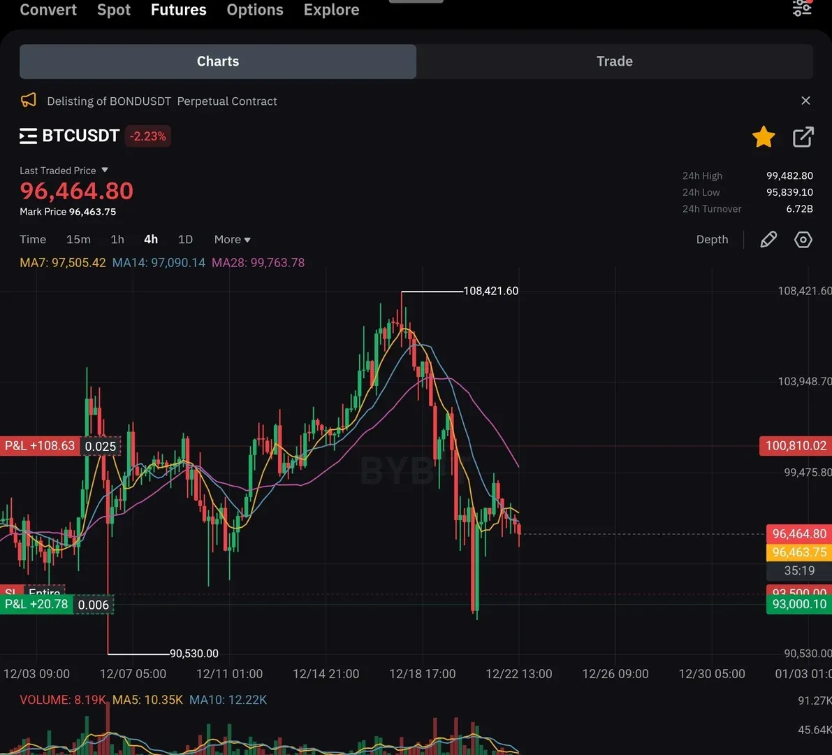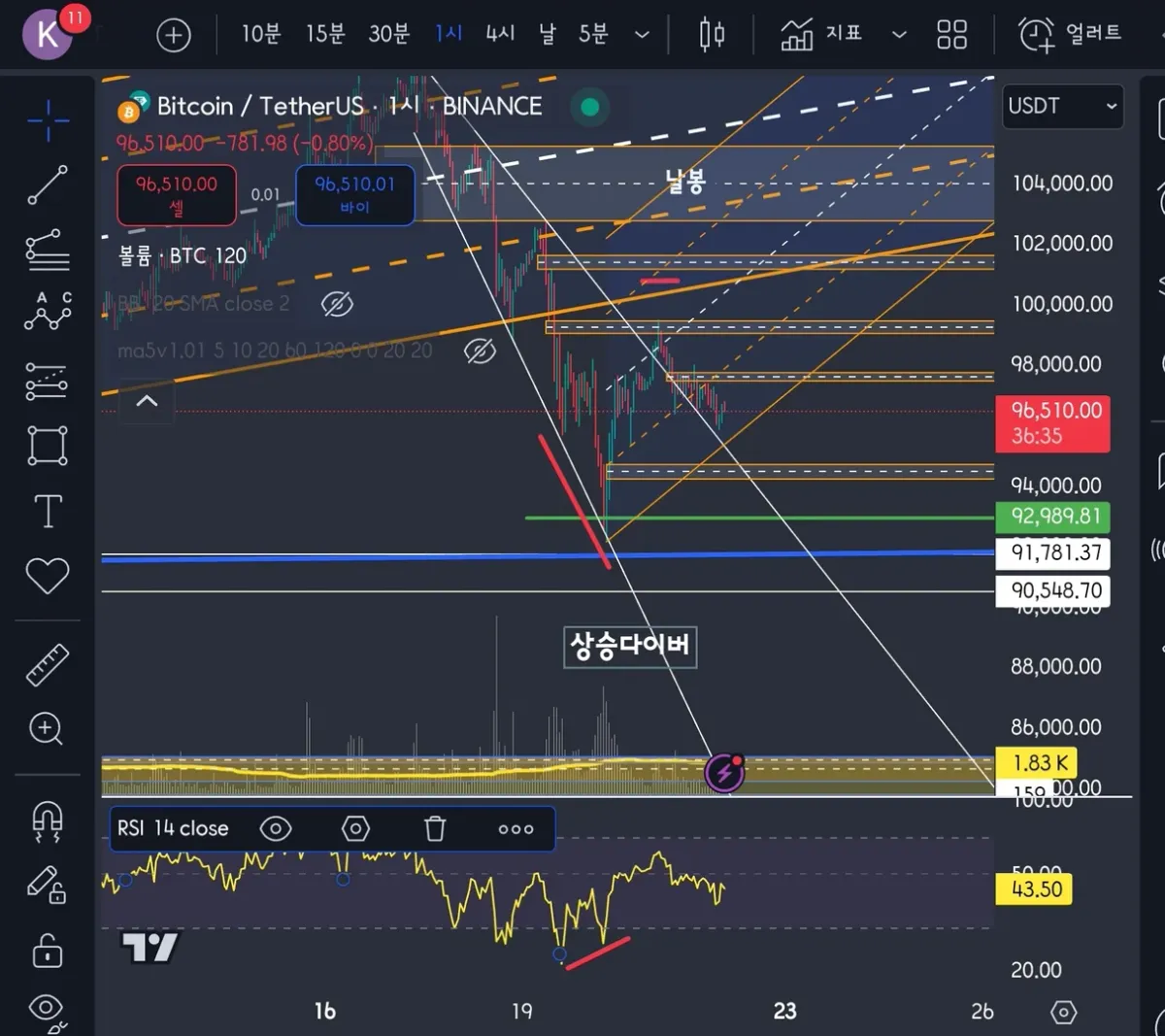 비트가 신고점을 넘을때 상승쐐기형 엔딩다야고날 패턴을 보이고 하락하는중 1시간봉 Rsi상승다이버 이전 강한지지구간 자리여서 한번쯤 반등을 해줄것을 보고 ABC로 반등하지않을까 하여 93000진입 99000에서 반절익절후 스탑로스설정 나머지 반절 홀딩중입니다 많이 부족한 차트분석이지만 열심히 해보겠습니다