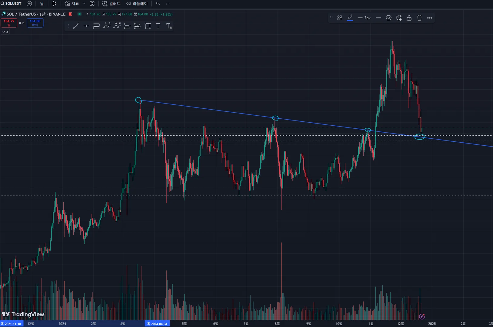 윗꼬리와 삼각 수렴 발산, 그리고 매물대를 근거로 솔라나 현물 매수했고, 아직 수익이나 손절은 없고 그 자리에 머물러 있습니다.