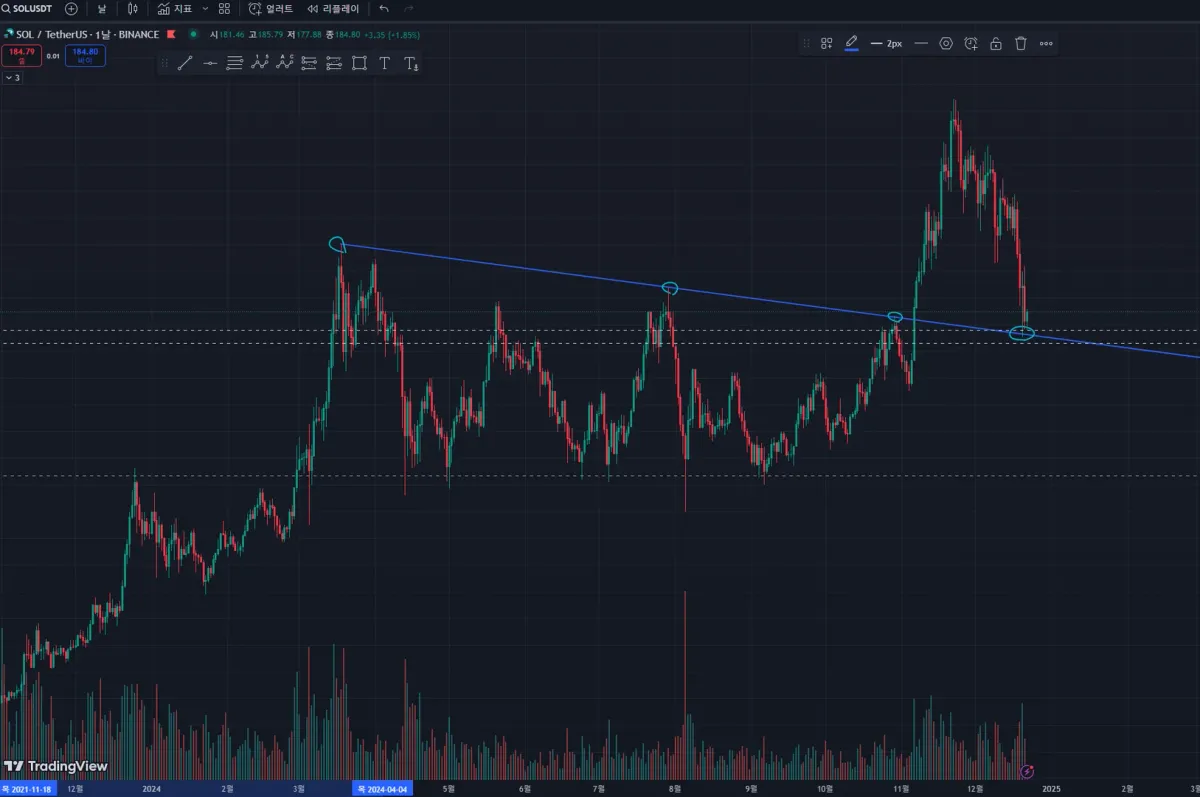 윗꼬리와 삼각 수렴 발산, 그리고 매물대를 근거로 솔라나 현물 매수했고, 아직 수익이나 손절은 없고 그 자리에 머물러 있습니다. 올리는 힘이 약하다면 본절이나 큰 하락 전에 매도하거나, 아니면 현물이니 그냥 홀딩하거나, 생각중입니다.