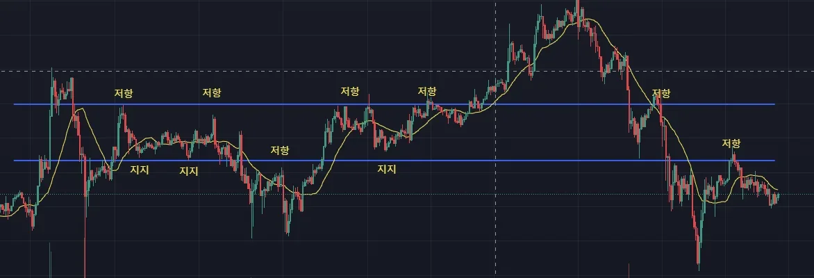 비트코인 1시간 봉 차트를 통해 지지선과 저항선을 작도해 보았습니다.