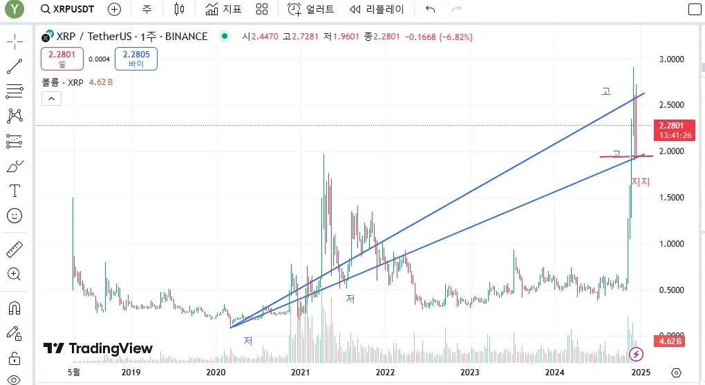 리플 주봉 차트로 분석해보았습니다. 저-저 지지선을 두 가지로 그어 현재 차트상 자리를 2번 확인한 모습을 살펴볼 수 있었습니다. 해당 지지선을 깨지 않으면 횡보하다가 상승할 것으로 예측해보았습니다.