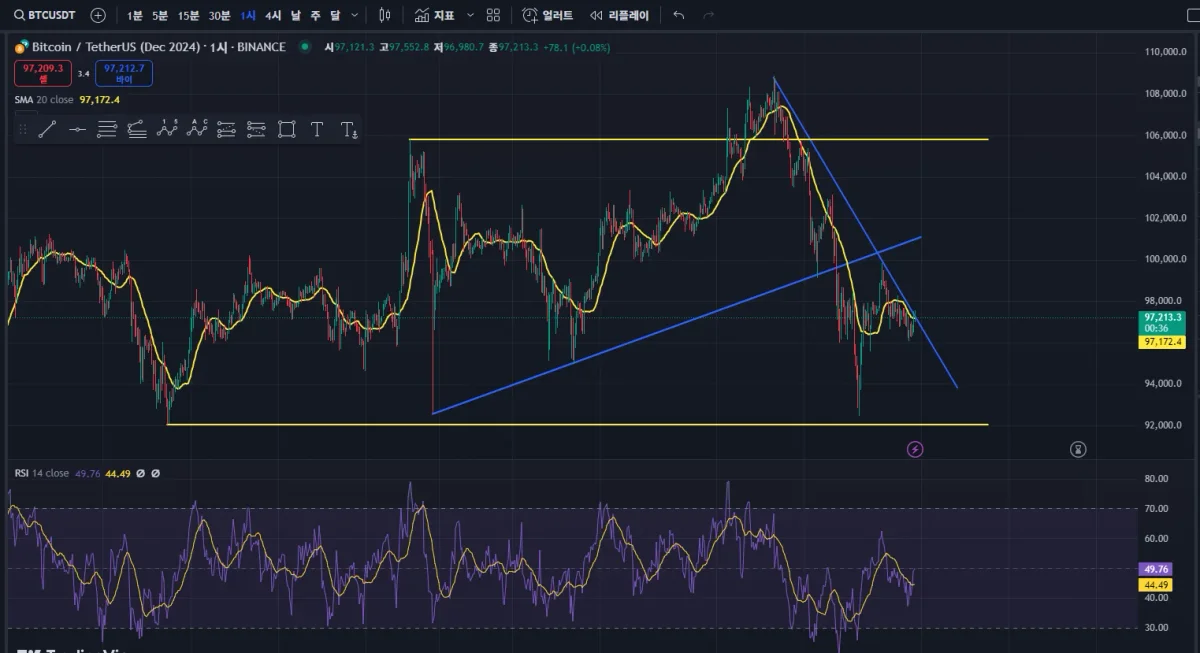 비트코인 1시간 봉으로 지지선, 저항선, 상승추세선, 하락추세선을 그려보았습니다.
