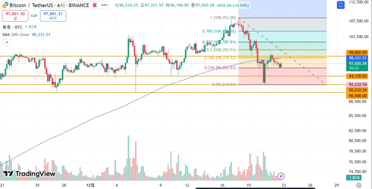 상승이 나온다면 피보나치 되돌림 및 상단 지지 저항선인 $98,300~98,800까지 상승하며 저항을 받을 것으로 보입니다.