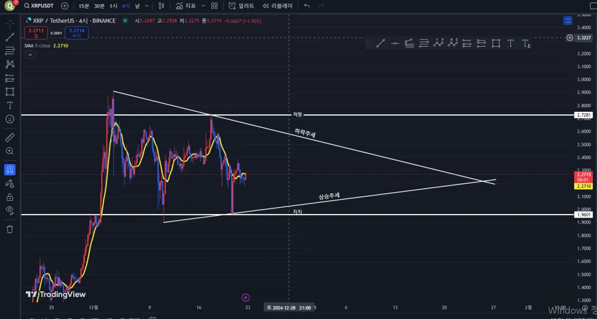 리플 4시간봉 입니다 추세선과 지지, 저항선을 설정 함으로써 앞으로의 투자 방향에 대한 기준이 생긴 느낌입니다. 처음 그어보는거라 안목이 모자라지만, 투자 종목에 대해 미리 설정 해 두고 경과를 지켜보면 많은 공부가 될 것 같습니다!