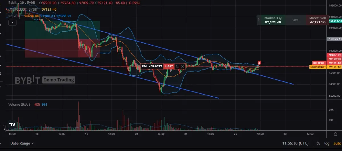 비트코인 4시간 차트상에서 하락 추세선을 설정하였고 현재 가격대가 하락 추세선의 상방이탈을 하여 해당 시점에 숏 포지션 진입하였습니다