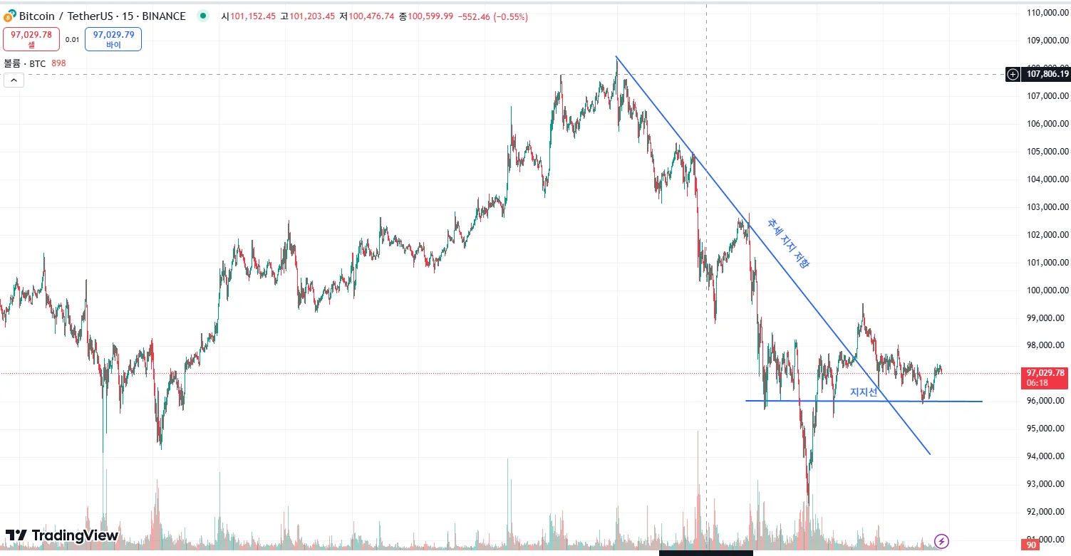 비트코인 15분봉으로 추세 지지 저항 표시해봤습니다. 아직 어렵지만 열심히 배워보겟습니다!