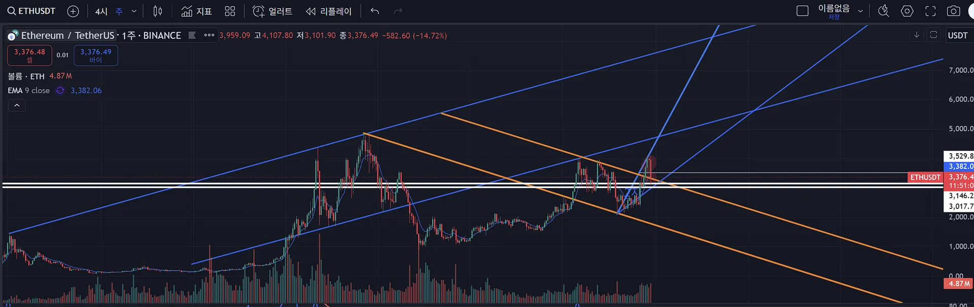 1) 이더리움의 주봉산 추세선 및 저항선입니다.