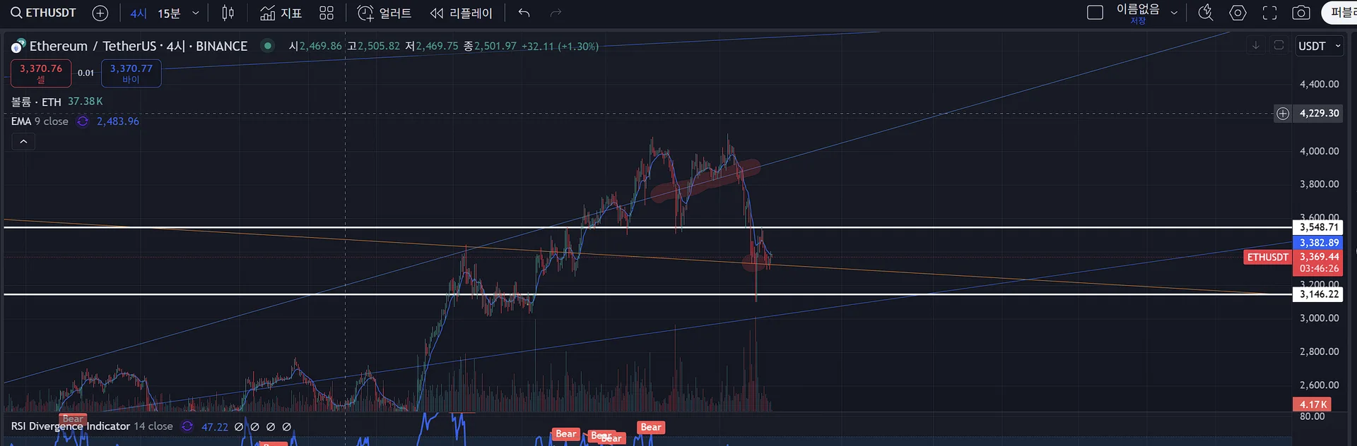 2) 이더리움 4h 지지선입니다.