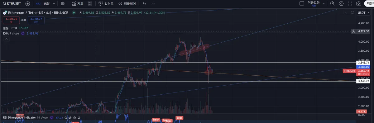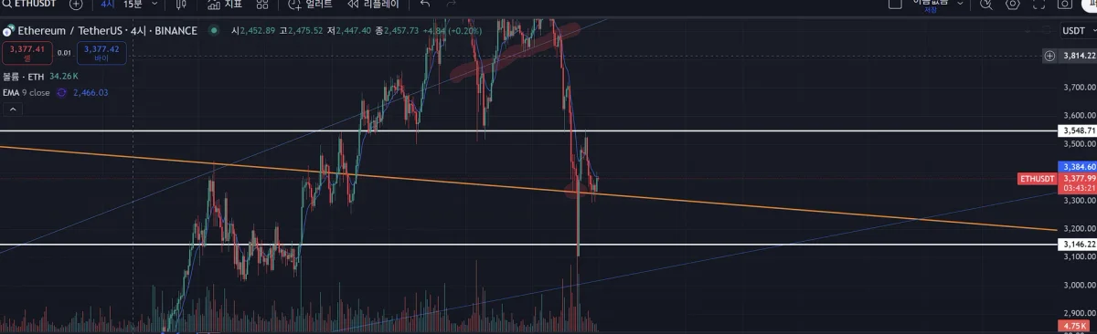 1) 이더리움의 주봉산 추세선 및 저항선입니다.
