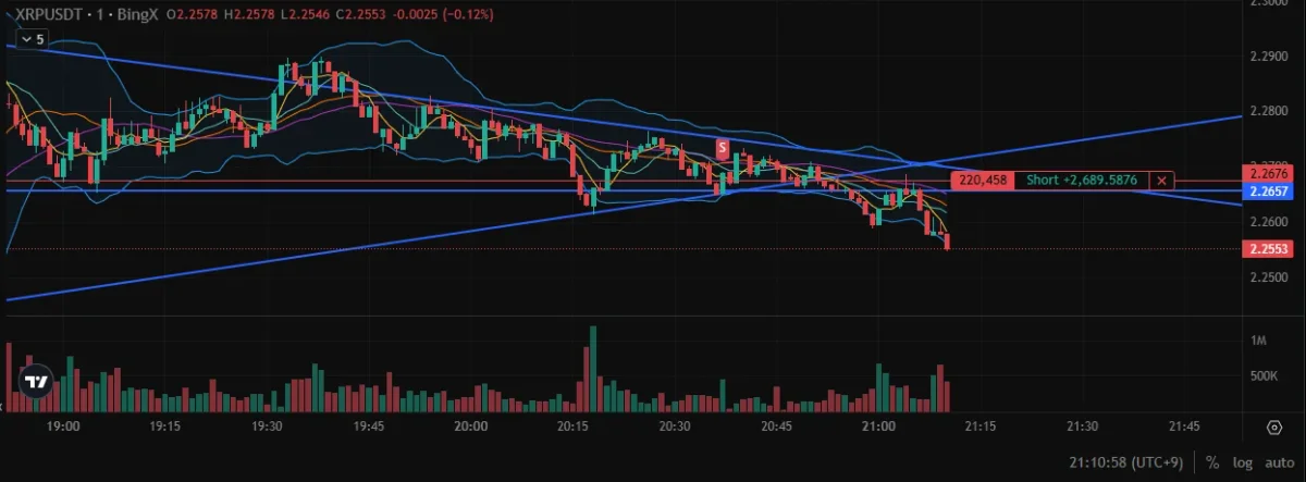 고점 추세선 작도를 통해 저항선 확인 후 볼밴을 보니 하단을 걸치면서 중단을 돌파하지 못하는 추세를 포착한 후 숏에 매수했습니다