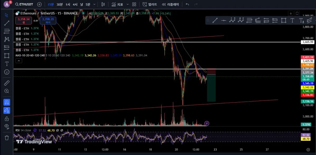 현재시간 22시 이더리움 가격은 USD 3,371 로, 이평선은 터치하였으나 위 저항선을 뚫는데에 어려움을 보이고 있는 것 같습니다.