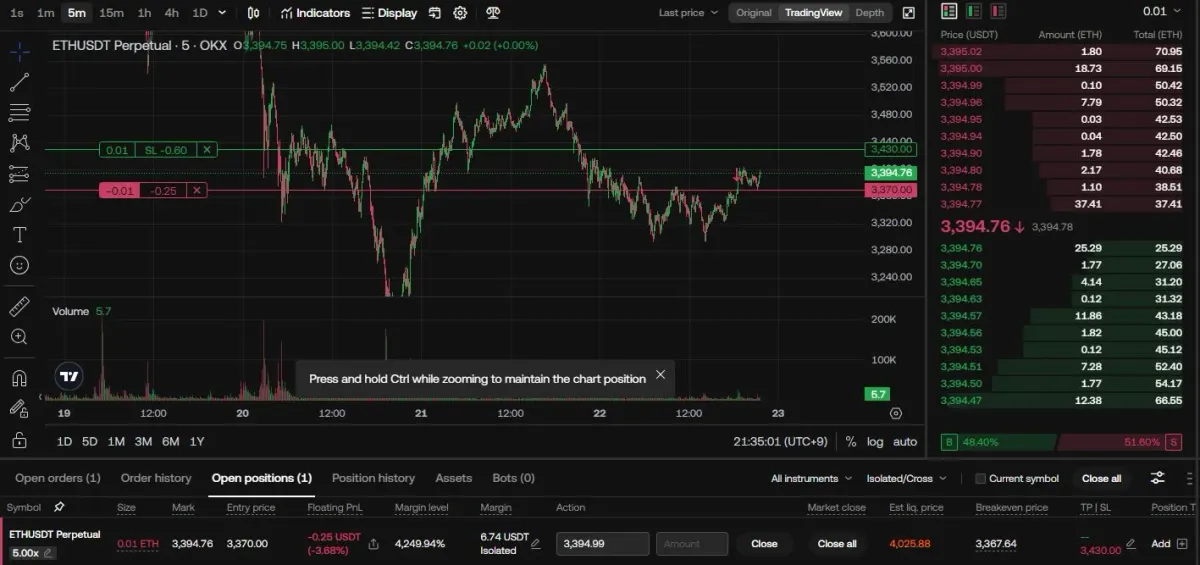 -> 이에 가격이 조금씩 올라오길래, 240선과 만나게되는 지점에 숏베팅을 하였습니다.