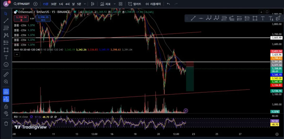 이더리움 15분봉을 확인한뒤, 짧은호흡으로 하락에 베팅해보고 싶었습니다.