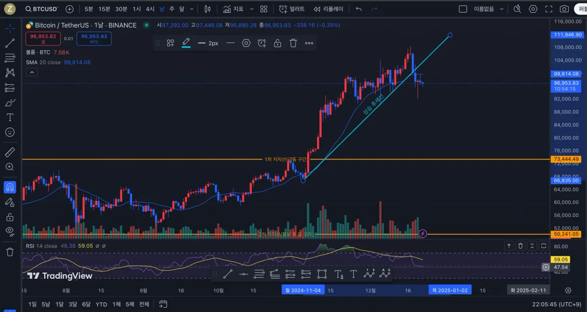 하하 많은 연습이 필요할 것 같네요.. 상승 추세선을 뚫고 내려오는 것으로 해석했는데 이후에 어떻게 될런지 지켜봐야 겠어요.