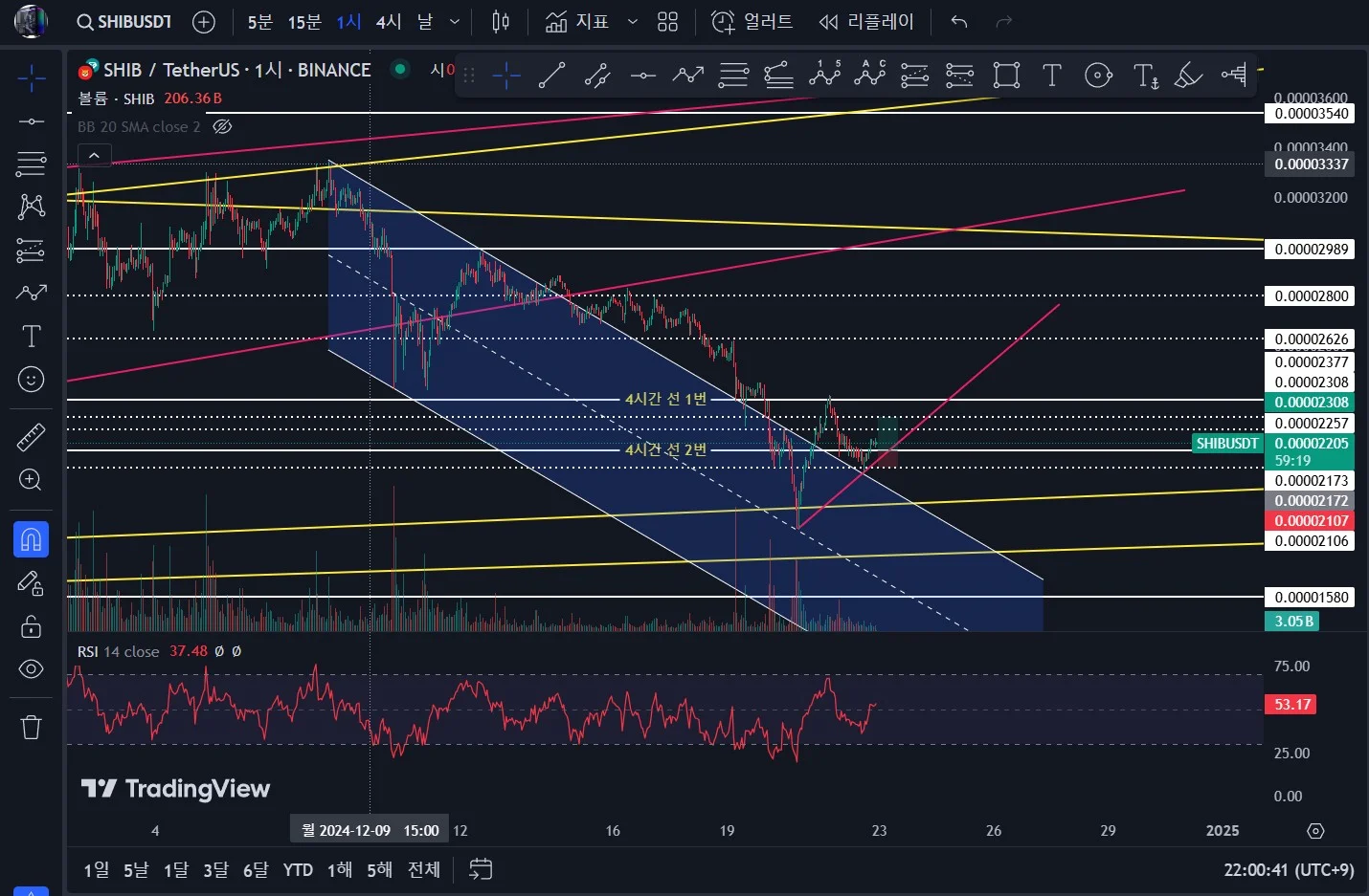 시바이누 1시간 봉 차트인데 지지,저항을 두고 하락 추세선 패러럴 채널을 적용시켜 보았습니다.
