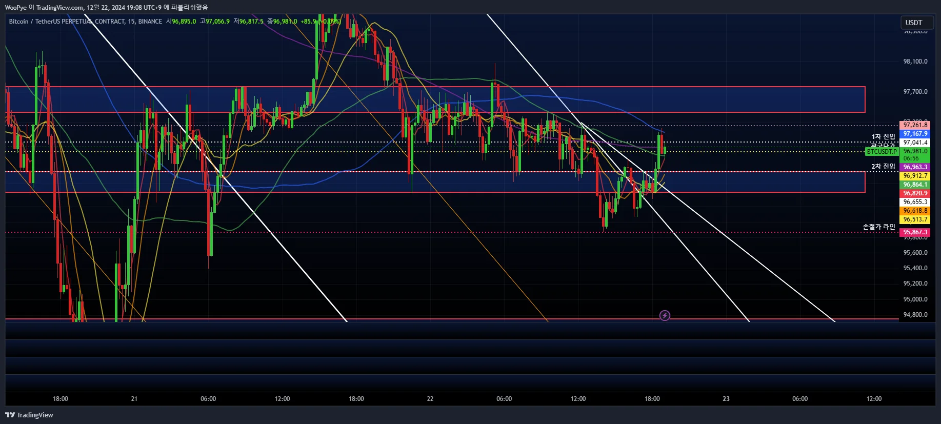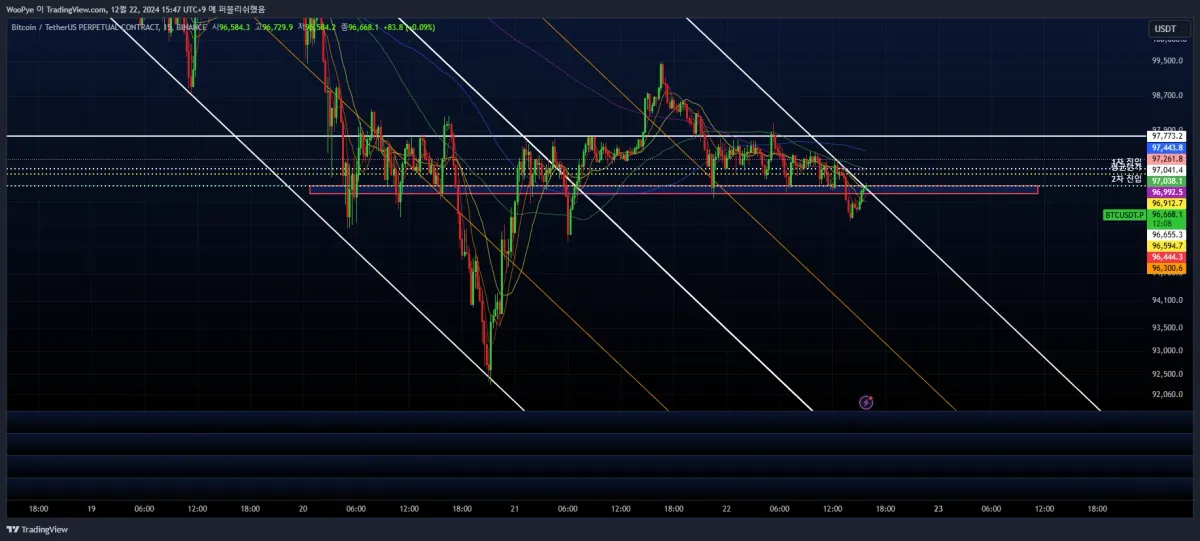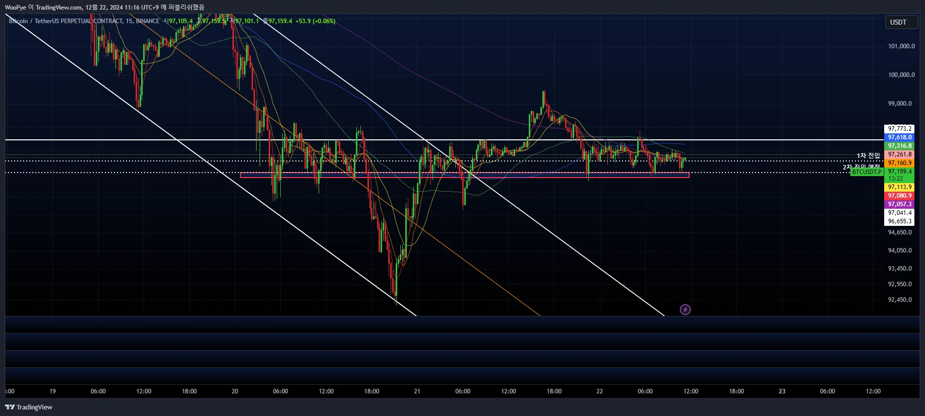 - 2차진입한 96,655.3k는 지지선이고 여기를 리테스트하고 올라갔기에 이지점에 도달하면 손절하는 것으로 손절가 변경.