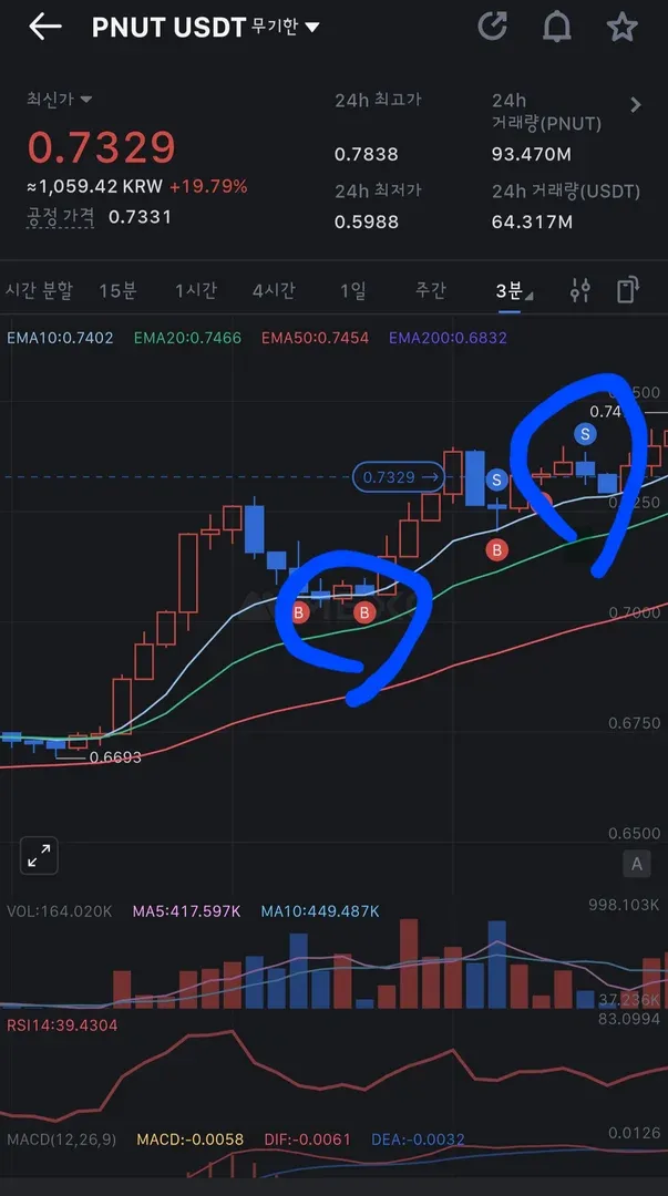 강력한 상승, 4시간봉 더블바텀, 눌리면서 거래량이 줄었다는