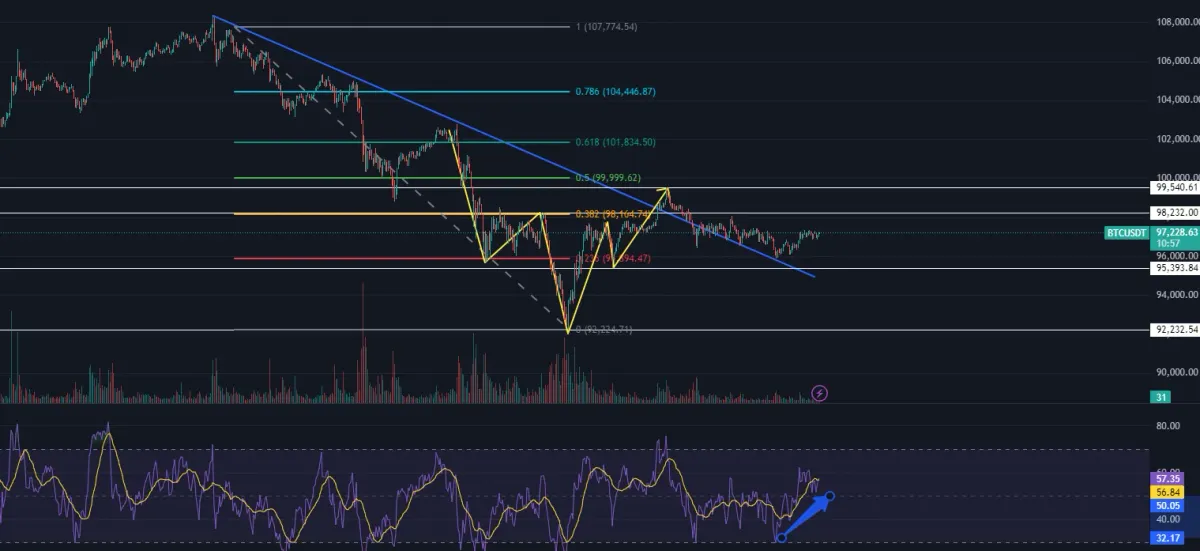현재 연습용으로 바이낸스선물에 넣어둔 자금 중 일부를 96K부근에서 작은 W자 계형을 그리는것을 보고 97K에서 1차 매수 진행하였는데 위의 조건 만족시 2차 매수를 들어갈 생각입니다.