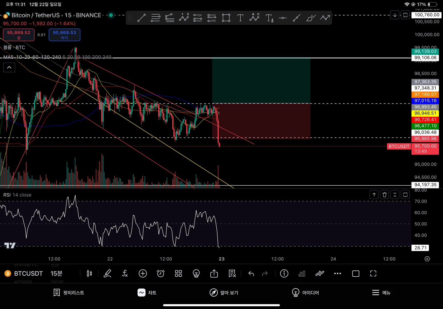 안녕하십니까 차티스트 입니다. 추세선과 가로선 활용 잘하셨습니다! 손익비는 1:2 이상이 이상적이지만, 상황에 따라 유연하게 조정하세요. 트레이딩뷰 도구로 손익비 계산 쉽게 가능하니 적극 활용해보세요! 😊