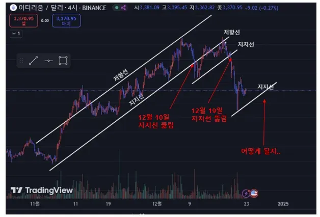 저는 24년 12월 22일 23시 기준 이더리움 4시간봉을 보았고,