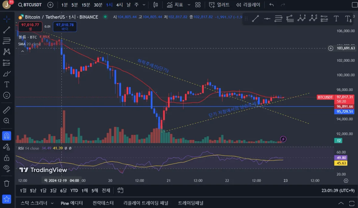 글 쓰는게 올라가지 않아 댓글로 남깁니다. 이번 단기 하락추세선과 상승추세선을 그려봤는데 뭔가 많이 부족하고 어색하네요,, 많이 연습을 해야될 것 같습니다.