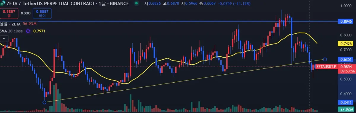 제타체인 저점이 계속해서 높아지고 있어서 크게 한번 상승 할 줄 알았는데 rsi지표가 급격하게 하락하면서 지지선을 이탈하고 계속 횡보하고 있네요.