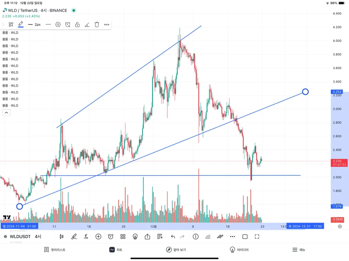 월드코인 꽤 높은 금액에서 일부 들어갔는데 현재 하락중이라 추가매수 지켜보고 있습니다.