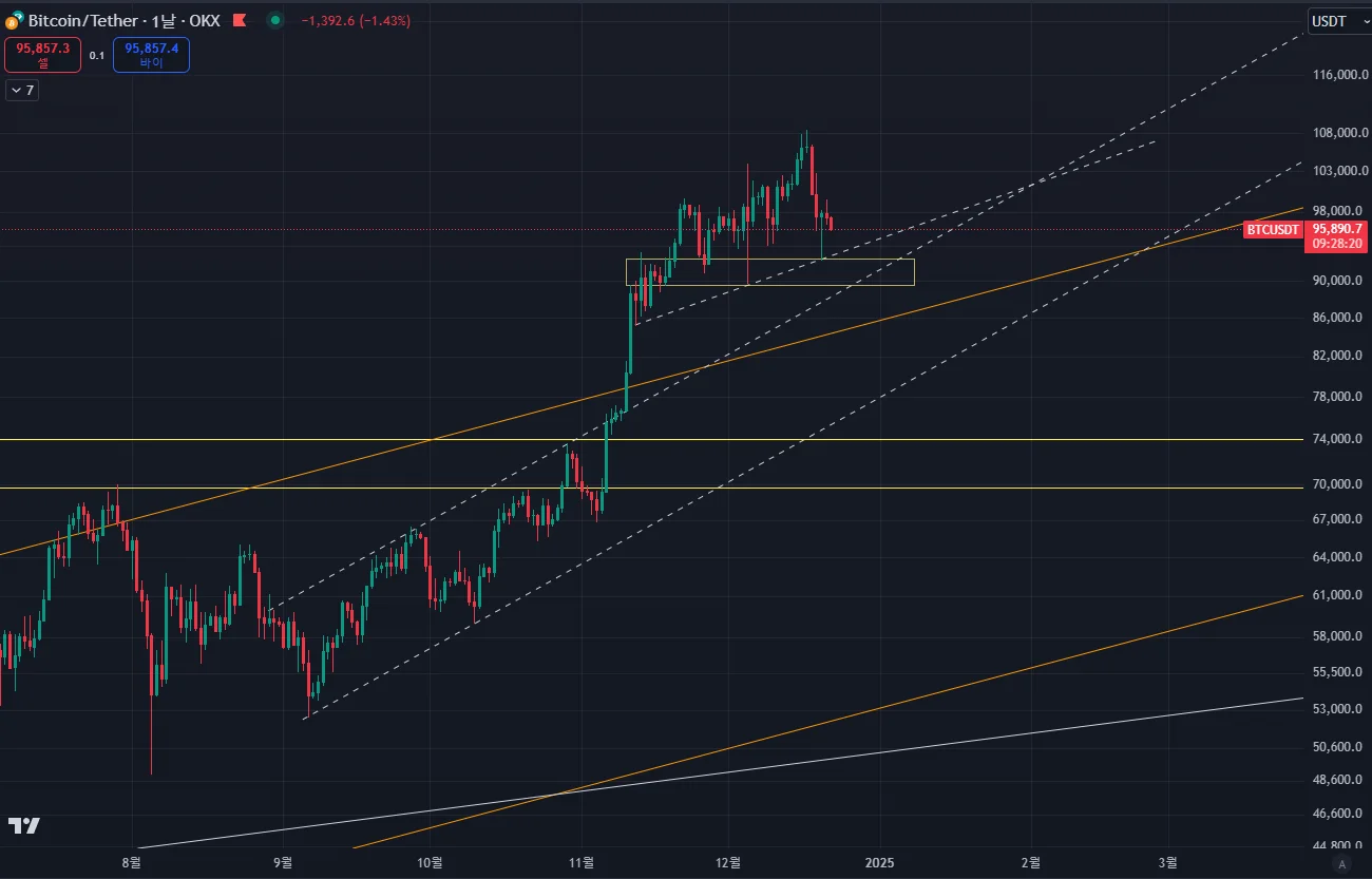 반대로 상승추세와 지지라인이 하나씩 무너지게 된다면 현물포지션과 롱포지션에 대한 리스크관리가 필요해보이는