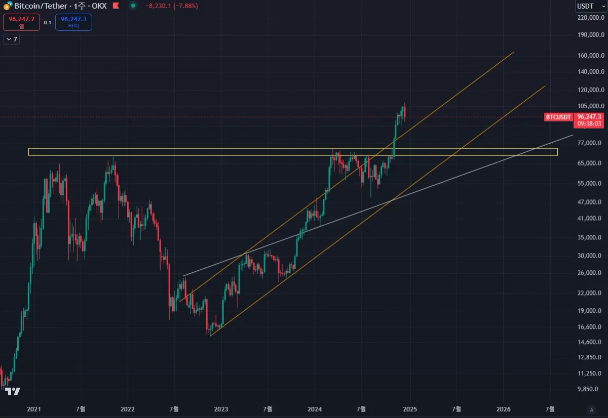 만약, 이 가격대가 지지를 못 받고 이탈이 나오게 된다면 그 밑 수평 지지라인인 70~73K 정도를 노려볼만해 보이고