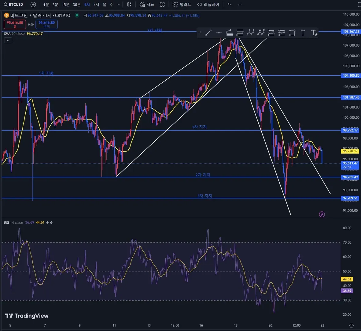 12월의 비트코인 1시간 단위 추세입니다. 최근 저항을 뚫고 올라 왔으나 다시 하락하는 추세를 보인다고 생각됩니다. 이렇게 추세선을 그어보니 다시 조정이 오는 것은 아닌지, 만일 하락한다면 2차지지선에서 지지할 지 궁금해집니다