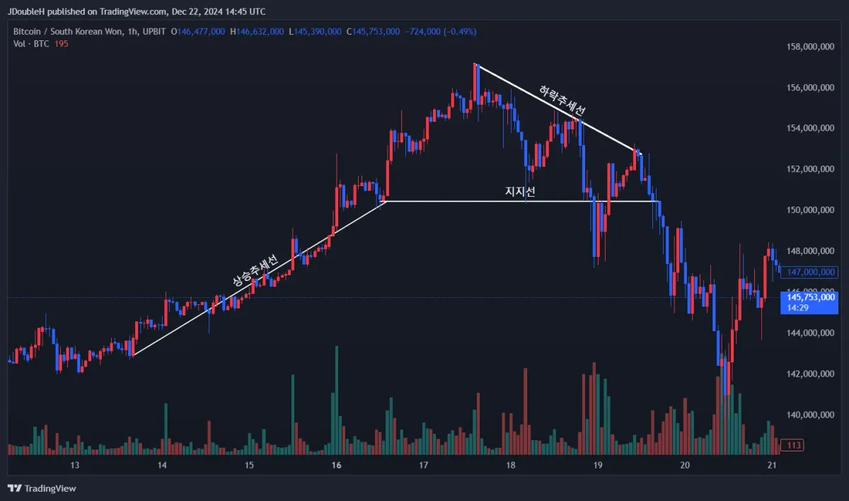 상승추세선은 저점과 저점을 이어서 그려주시면 되겠습니다. 한번 교정해보세요~ 지지선은 잘그려주셨습니다. 라인으로 볼수도있지만 영역으로 보고 접근할수도있겠네요. 하락추세선 연장해서 길게~ 뽑아보시면 유의미한 기준으로도 활용할수있습니다!! 화이팅이에요!
